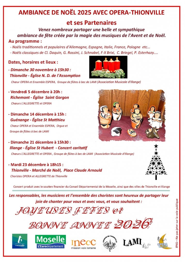 Ambiance de Noël 2025 avec OPERA-Thionville et ses Partenaires. Venez nombreux partager une belle et sympathique ambiance de fête créée par la magie des musiques de l'Avent et de Noël. Les responsables, les musiciens et l'ensemble des choristes sont heureux de partager leur joie de chanter pour vous et avec vous, et vous souhaitent : JOYEUSES FETES et BONNE ANNEE 2026 !