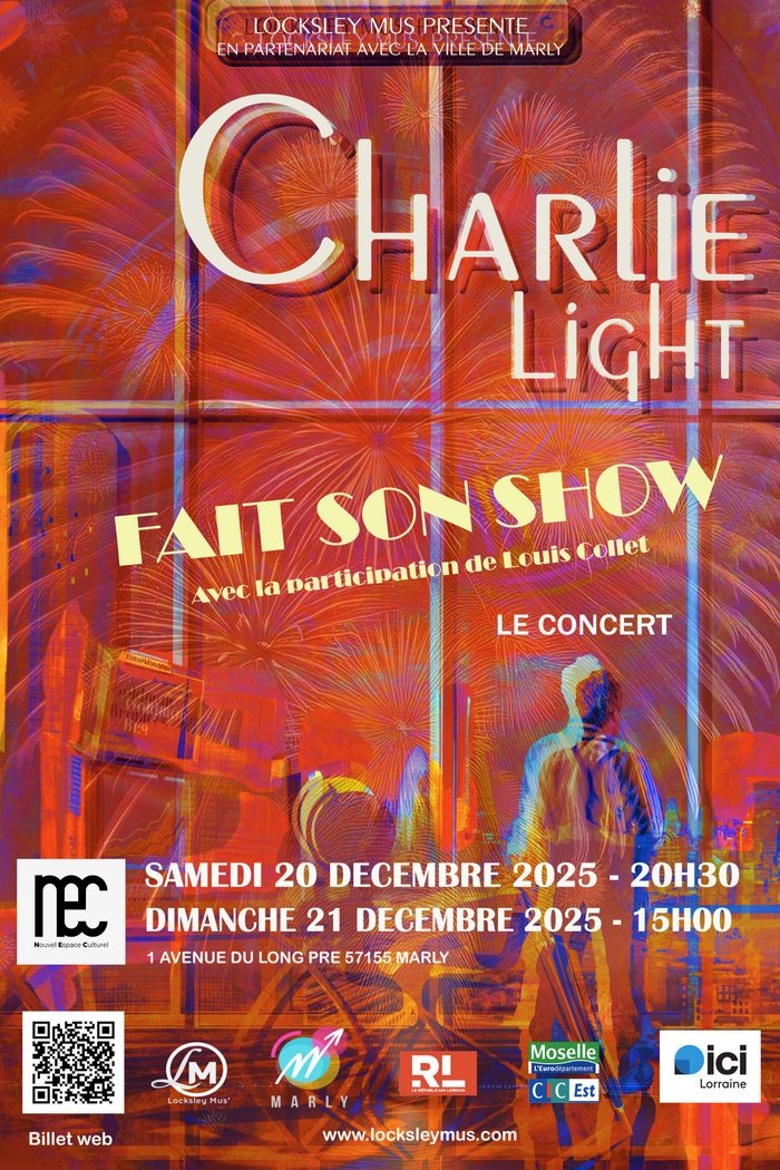 Charlie Light est de retour au NEC de Marly dans une version concert inédite pour 2 dates: le samedi 20 décembre 2025 à 20h30 et le dimanche 21 Décembre à 15h. Avec Sophie Delmas à la mise en scène, Matteo Reggiori à la chorégraphie et dans le rôle principal et Louis Collet dans le rôle de Jackie. Un cadeau de Noël avant l'heure !