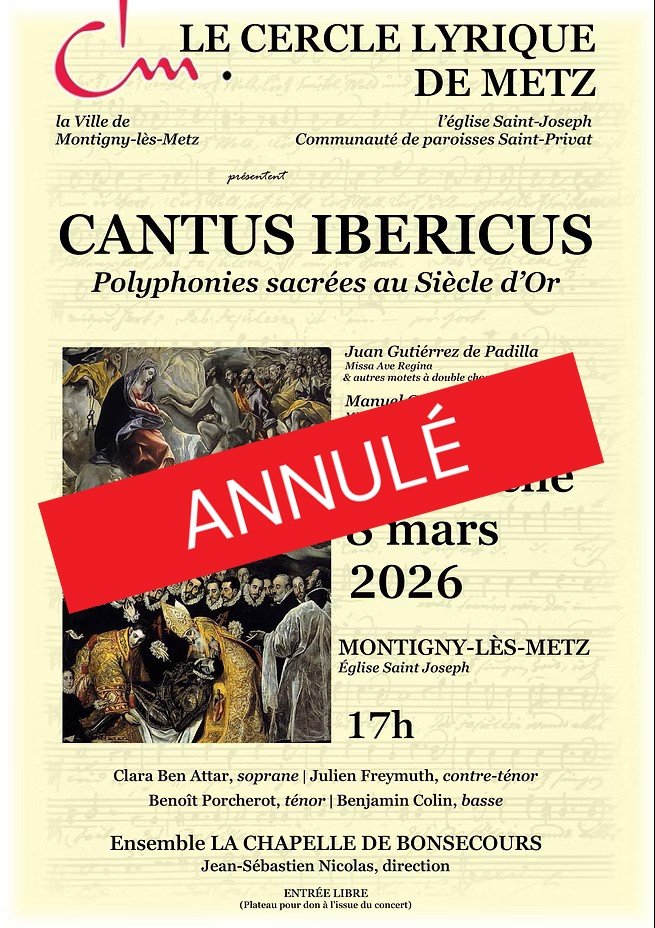Nous vous informons que le concert CANTUS IBERICUS, initialement prévu ce dimanche 8 mars 2026 à la Chapelle de Bonsecours, est annulé par l'organisateur. Nous avons choisi de maintenir cette fiche pour éviter tout déplacement inutile du public. Nous vous remercions de votre compréhension.