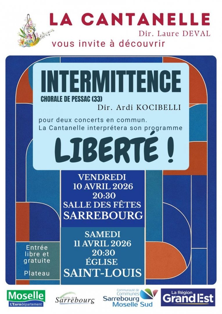 Dans le cadre d'un échange entre chorales, la Cantanelle fait découvrir le territoir de Sarrebourg à la chorale Intermittence de Pessac (33). Au cours de ce séjour, les deux choeurs proposent deux concerts communs. Le premier à Sarrebourg le vendredi 10 avril 2026 à 20h30 à la salle des fêtes de Sarrebourg, le deuxième à l'église de Saint Louis (57) à 20h30.