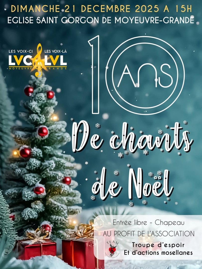Nous vous invitons à notre concert de Noël le dimanche 21 décembre 2025 à 15h à l'église Saint-Gorgon de Moyeuvre-Grande. Rejoignez-nous pour une après-midi de chants de Noël, de joie, de partage et de convivialité. Nous chanterons ensemble... un pur moment de détente et de plaisir.Des boissons chaudes pour se réchauffer... de jolis petits gâteaux de Noël pour satisfaire les gourmands, de quoi vous faire plaisir. Nous avons entendu dire que le Père Noël nous rendra visite. Comme tous les ans... parce que Noël c'est aussi la solidarité nous chanterons au profit d'une association caritative et les dons récoltés lors de ce concert iront à l'Association Troupe d'Espoir et d'Actions Mosellanes. Votre générosité aidera à soutenir une cause qui nous tient à coeur. Chaque don compte et fera une différence pour ceux qui en ont besoin Nous vous attendons nombreux !