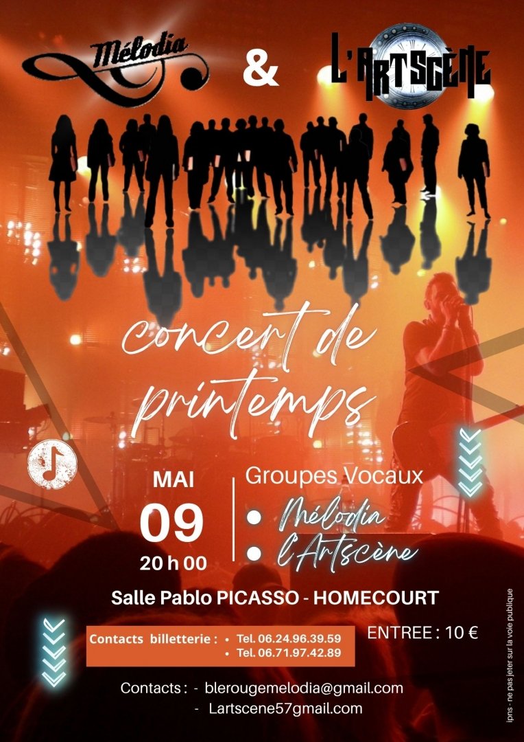 Mélodia et L'ArtScène vous donnent rendez-vous pour leur grand concert de printemps ! Un moment musical chaleureux, dynamique et plein d'émotions, porté par deux groupes vocaux passionnés avec un groupe de 4 musiciens.