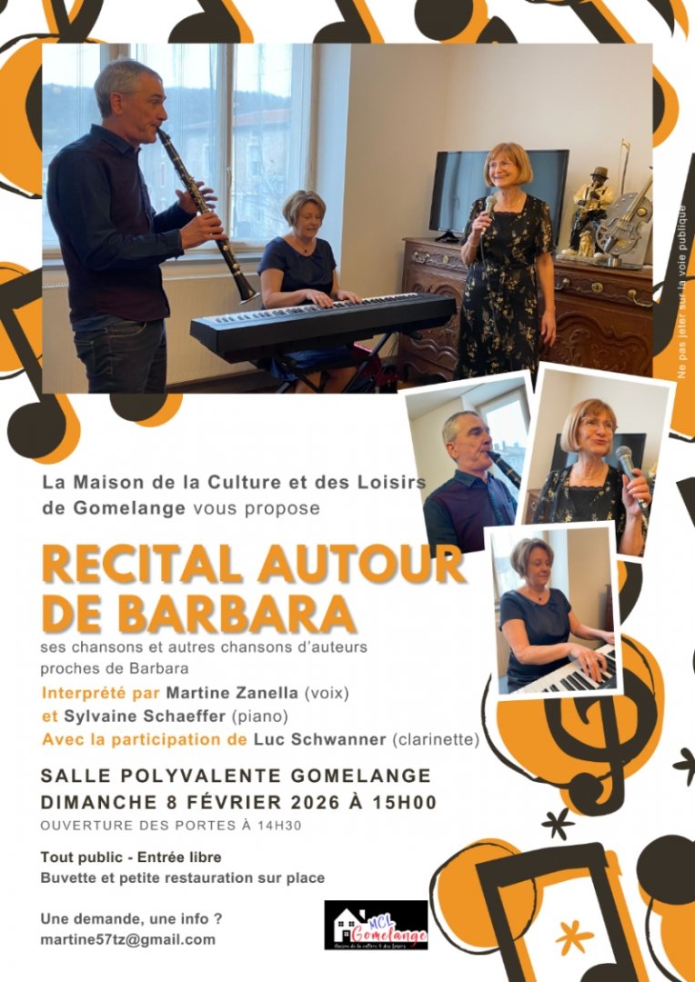Récital présenté par 3 amis passionnés de musique et chant, mettant en lumière les multiples facettes de Barbara au travers de 14 titres aux mots ciselés et profonds, universels, écrits et composés par cette artiste hors norme. Le récital est complété de 10 titres d'auteurs compositeurs interprètes qui ont compté pour elle dans sa carrière ou sa vie personnelle, permettant de la comprendre plus encore