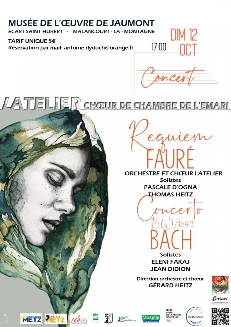 Latelier - Choeur de chambre de l'Emari vous invite à venir écouter l'un des requiem les plus délicats et émouvants : le Requiem de Fauré. Le choeur Latelier sera accompagné par un petit orchestre à cordes qui, en préambule, jouera le plus connu des concertos de Bach, le BWV 1043 (solistes: Eleni Fakaj et Jean Didion). Le classique, version chorale et passion ! Un concert exceptionnel, à ne pas manquer.