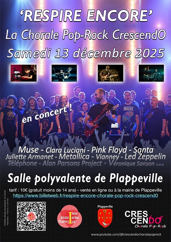 La Chorale Pop-Rock CrescendO revient avec un nouveau spectacle vibrant : Respire Encore. Une soixantaine de choristes passionnés de chant polyphonique et portés par cinq musiciens électrisants venus de la planète pop-rock nous emmènent avec eux dans un univers où chaque souffle devient une note, chaque battement de coeur une mesure. Dans une mise en scène poétique et moderne, les voix s'entrelacent et racontent, en musique, notre besoin d'air et d'évasion. Avec des harmonies à couper le souffle, le répertoire traverse les époques et les styles : Muse, Juliette Armanet, Metallica, Michel Berger, Santa, Renaud, Clara Luciani, Pink Floyd, Vianney, Deep Purple, Alan Parsons, Led Zeppelin, et bien d'autres encore.