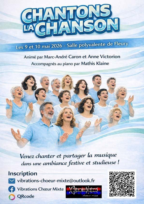 Marc-André Caron revient parmi nous les 9 et 10 mai prochain ! Vous avez surement envie de revivre ces moments gais et chaleureux, partager le plaisir de chanter... Vibrations vous invite avec enthousiasme  le samedi 9 et dimanche 10 mai 2026 à Fleury à un nouveau week-end chantant animé par Marc André Caron et Anne Victorion, accompagnés par Mathis Klaine