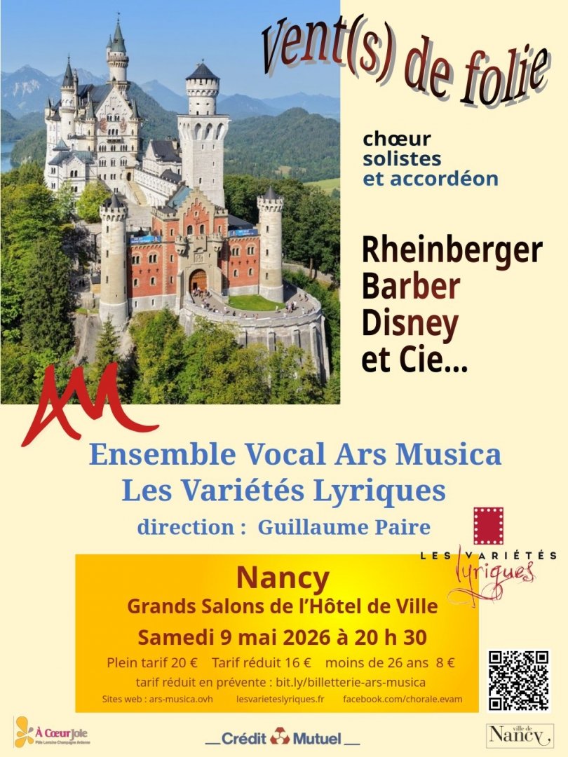 Sous la direction de Guillaume Paire, chef associé à l'Opéra de Nancy et en collaboration avec les solistes professionnels des Variétés Lyriques, l'Ensemble vocal Ars Musica présente son nouveau spectacle intitulé "Vent(s) de folie ", un programme-surprise qui trouve un malin plaisir à mêler pièces classiques (Rheinberger, Fauré, Mozart, Rossini...) et fantaisies contemporaines, notamment des extraits de films d'animation signés Walt Disney.