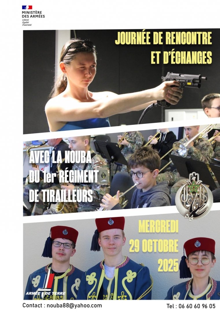 Une grande journée de découverte et de partage de la Nouba du 1er Régiment de Tirailleurs d'Epinal aura le 29 octobre 2025 à la Caserne Varaigne et permettra aux jeunes instrumentistes qui le souhaitent de vivre une journée en immersion avec les musiciens de la fanfare militaire.